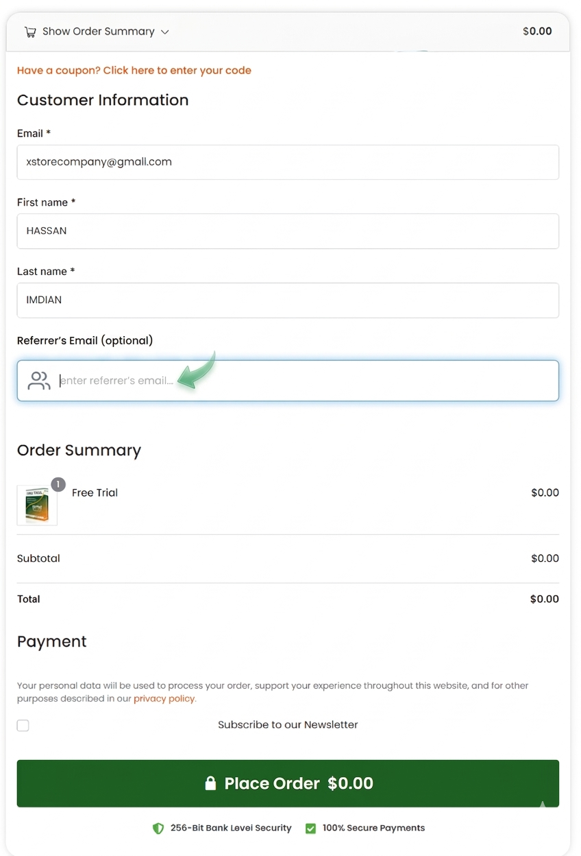 In the checkout page. As shown in the image below, enter your referrer’s email to unlock your reward. We’ll verify it instantly.